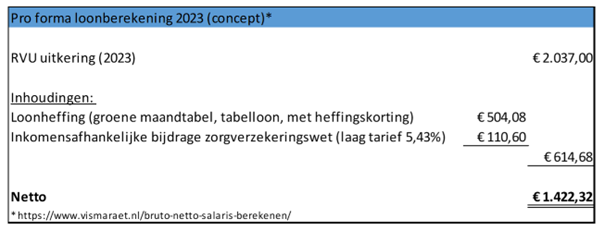 Sinds 1 januari 2022 kent de Pluimveeverwerkende Industrie de zogenaamde RVU-regeling. Hiermee kunnen medewerkers met een zwaar beroep onder voorwaarden maximaal 3 jaar voor de AOW-gerechtigde leeftijd stoppen met werken. Als een medewerker van deze regeling gebruikt maakt, ontvangt de medewerker een maandelijkse RVU-uitkering. Het van RVU-heffing vrijgesteld bedrag voor 2023 bedraagt €2.037,- per maand. Een RVU-gerechtigde houdt van de bruto RVU-uitkering in 2023 per maand €1.422,32 over. Onderstaand de loonberekening die de AWVN hiervoor heeft gemaakt: